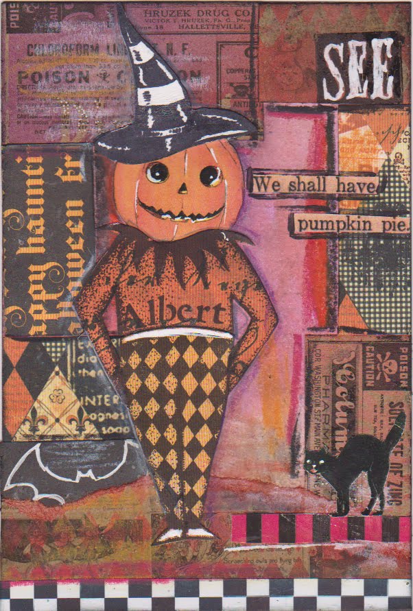... is the theme for Grungy Monday No. 22, so I´ve made this Halloween tag using the following Tim Holtz products: Kraft Resist paper, Seasonal Distress Inks set (wiped on a sanded black tag), Halloween tissue tape, Distress Stain picket fence, and cat die cut. The spider net is an IndigoBlu stamp, so this tag also qualifies for the new Creavil challenge themed Halloween.