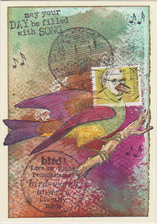 My second card "Silken Wings" was made with a bird stamp from Katzelkraft, the text stamps are from Red Lead again, and the postal stamps are from Stampington.
